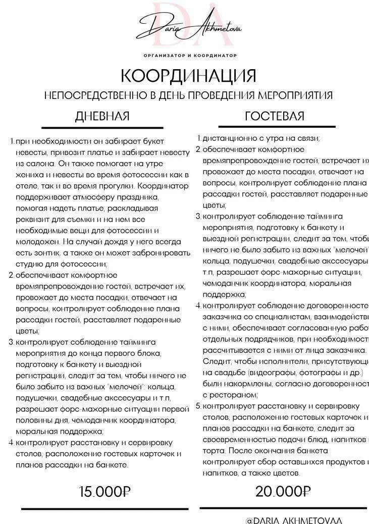 Прозрачность — это основа моего подхода. Я всегда открыто делюсь процессом работы, чтобы вы знали, что происходит на каждом этапе подготовки. Я считаю, что доверие между мной и вами — это залог успешного мероприятия