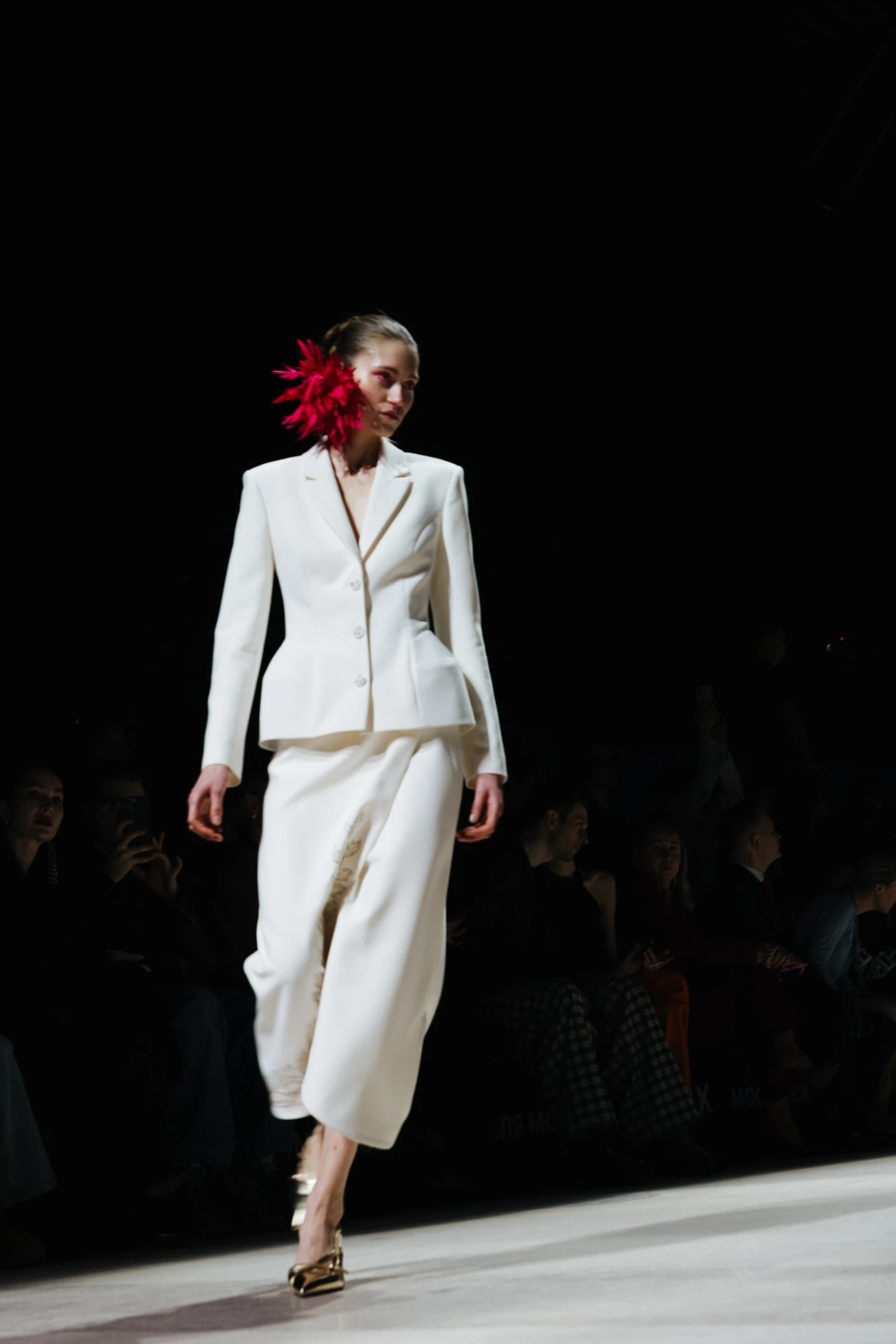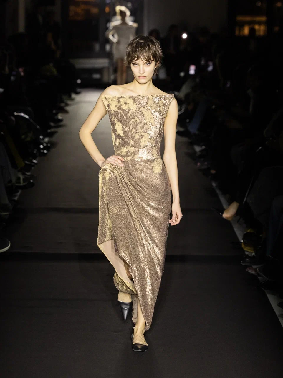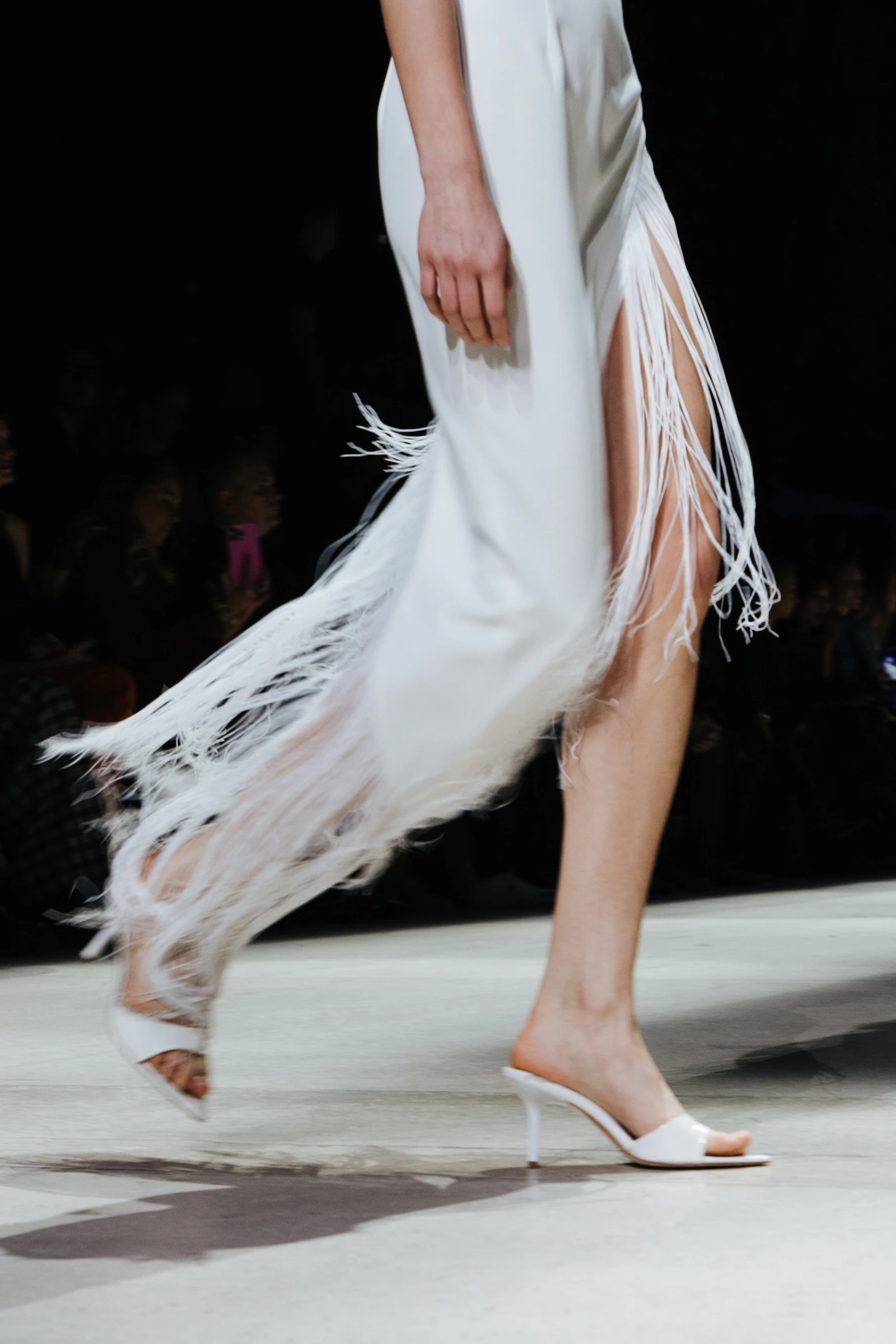 Речь идет о перьях — прежде всего о длинных страусиных, которые визуально перекликаются с бахромой и создают схожий эффект движения. Эти выразительные детали выходят за рамки привычного декора: они украшают не только платья и юбки, но и изящно обрамляют манжеты и воротники.