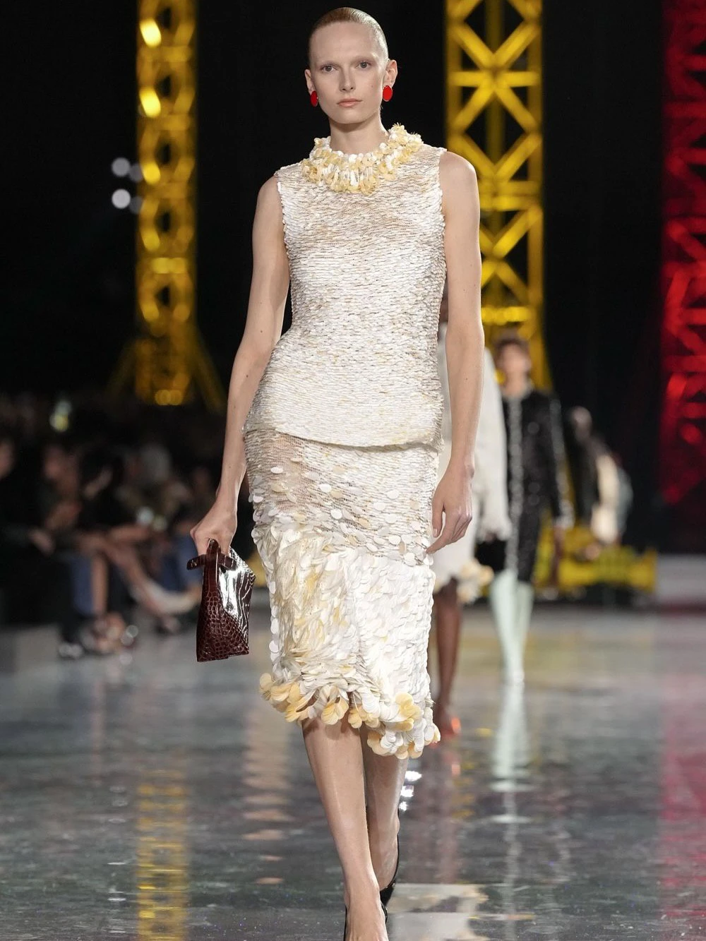 Платья давно перестали быть ключевым нарядом для церемонии: невесты активно присматриваются и к изящным костюмам, но не каждая решиться на смелый комплект. Теперь же дизайнеры рекомендуют собрать всю волю в кулак и все-таки сделать ставку на акцентные варианты. А лучше — максимально фантазийные и нетипичные. Например, Сhanel предлагают примерить удлиненный топ в рифме с юбкой-миди. Вроде ничего сверхестественного, но это был бы не Матье Блази, если бы не расшил изделия пайетками разных размеров, имитирующих ракушки. А вот McQueen сделали ставку на виральные капри и корсетный топ с ажурной пышной баской. Отличный и даже безопасный вариант на свадьбу, ведь верх комплекта напоминает мини-платье, просто в альянсе с удлиненными шортами — их, кстати, точно редко встретишь в загсе или на свадьбе.