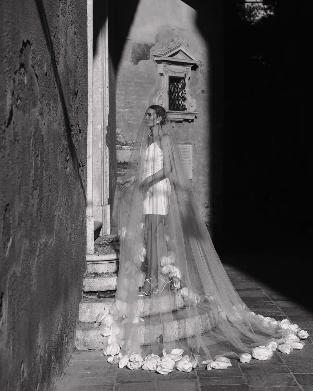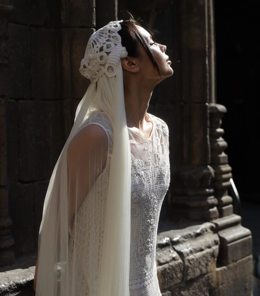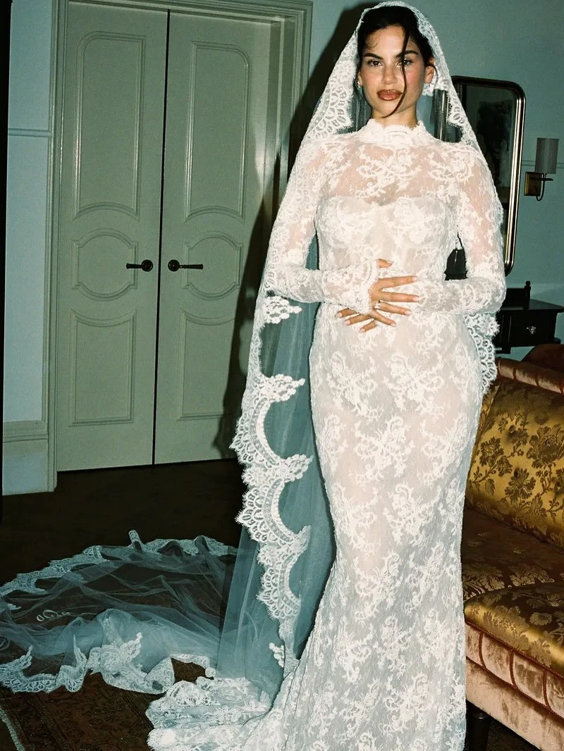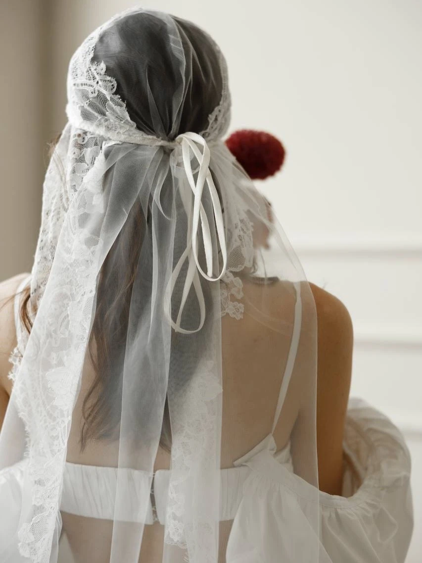 Это один из самых «требовательных» трендов, где решающую роль играет не форма, а специфика узора. Здесь особенно важно соблюдать стилистическую точность: орнаменты должны либо совпадать с фактурой платья, либо быть визуально совместимыми. Например, рифма плотного кордового кружева и тонкого шантилье в одном образе почти всегда приводит к визуальному конфликту текстур. Отдельного внимания заслуживает способ стилизации: фату с крупным кружевом можно закрепить так, чтобы узор мягко обрамлял лицо. В этом случае аксессуар выглядит максимально чисто по форме, сохраняя при этом выразительность и сложность деталей — без перегрузки, но с высокой степенью изысканности.
