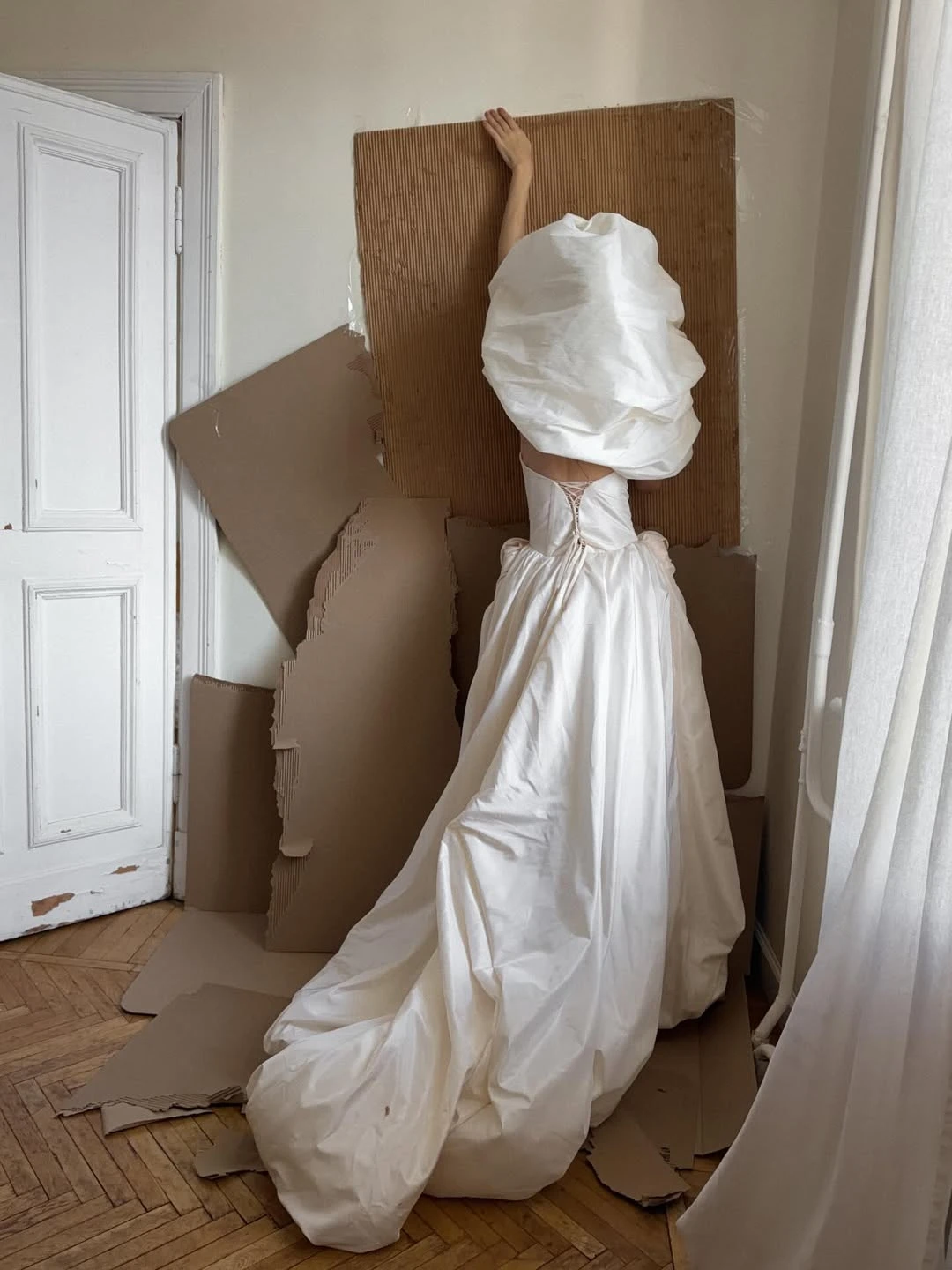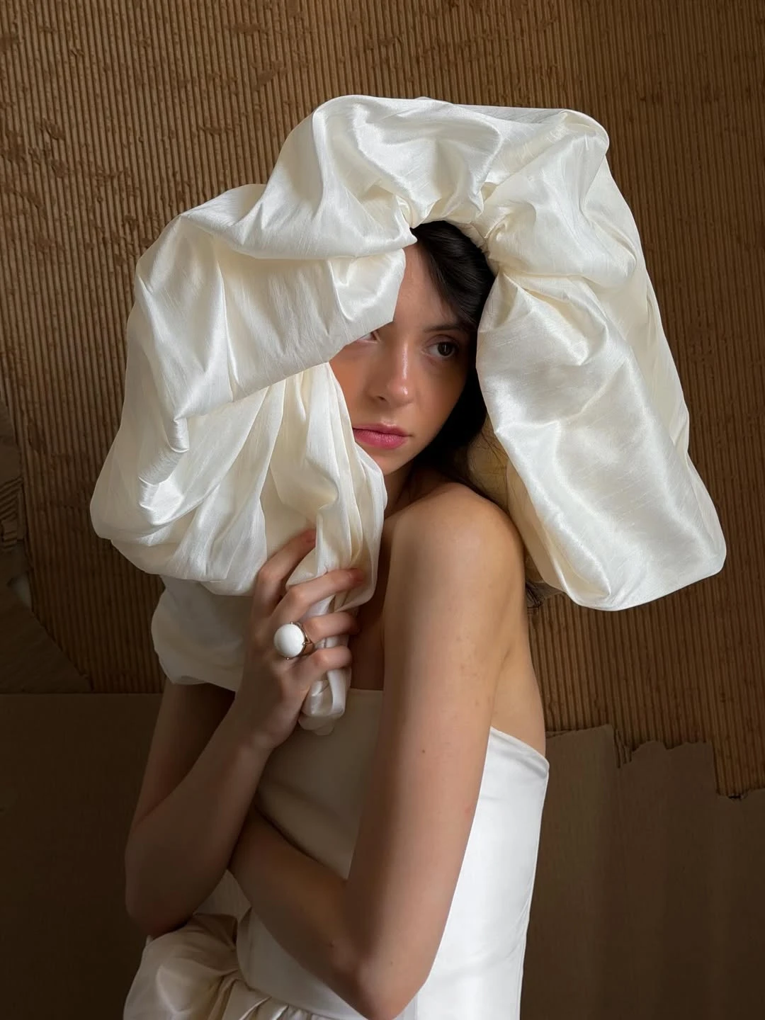 Материал в этом случае решает все. Шелк дает более мягкий, текучий объем — он выглядит живым и подвижным. Атлас за счет плотного плетения и характерного блеска создает более структурный силуэт. Сатин — сдержанная интерпретация: он тоже держит форму, но делает объем мягче за счет менее выраженного мерцания ткани.