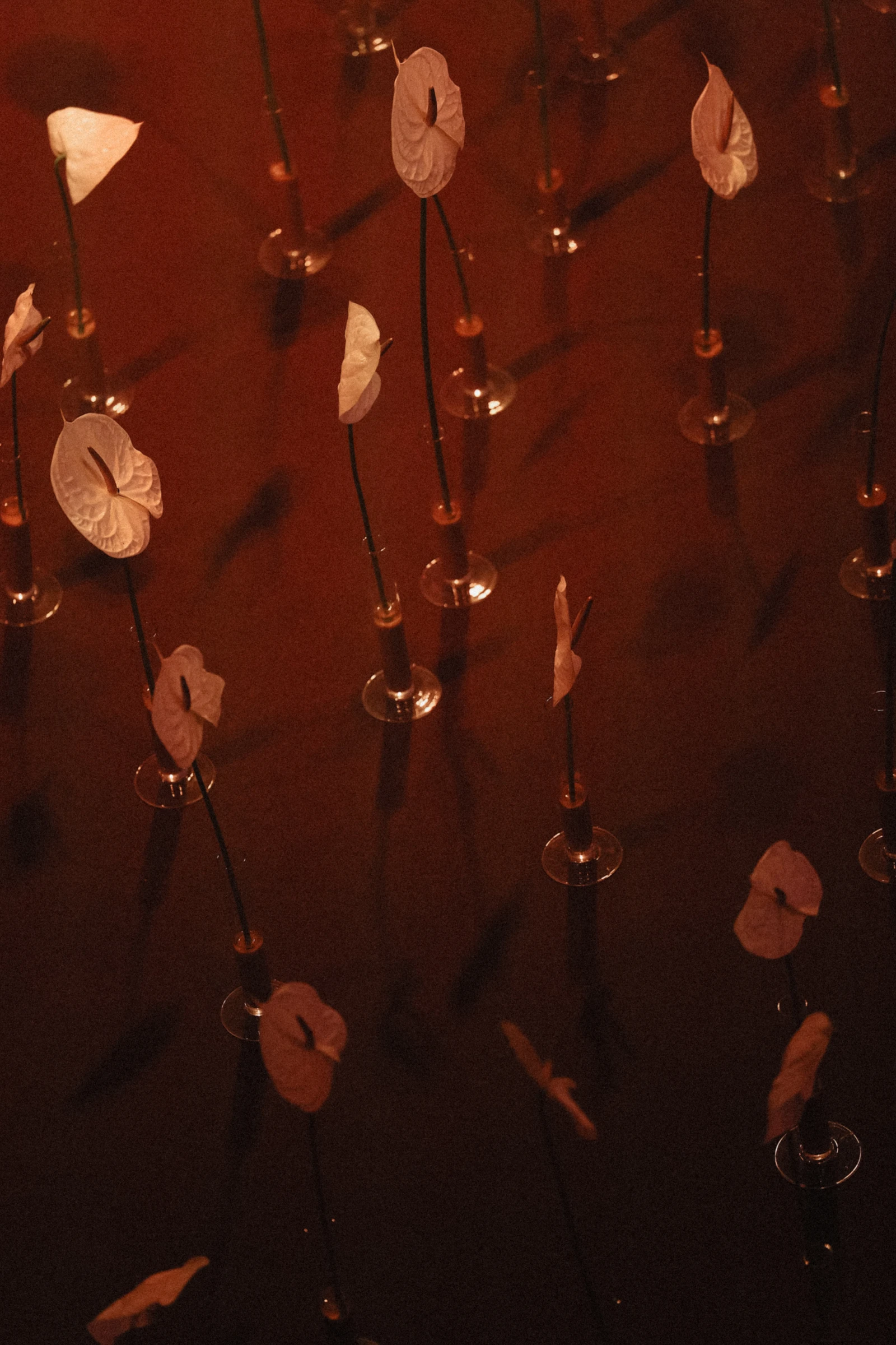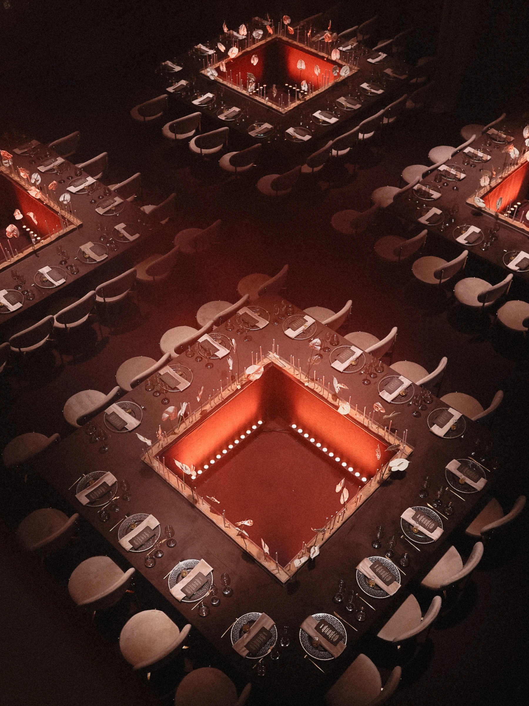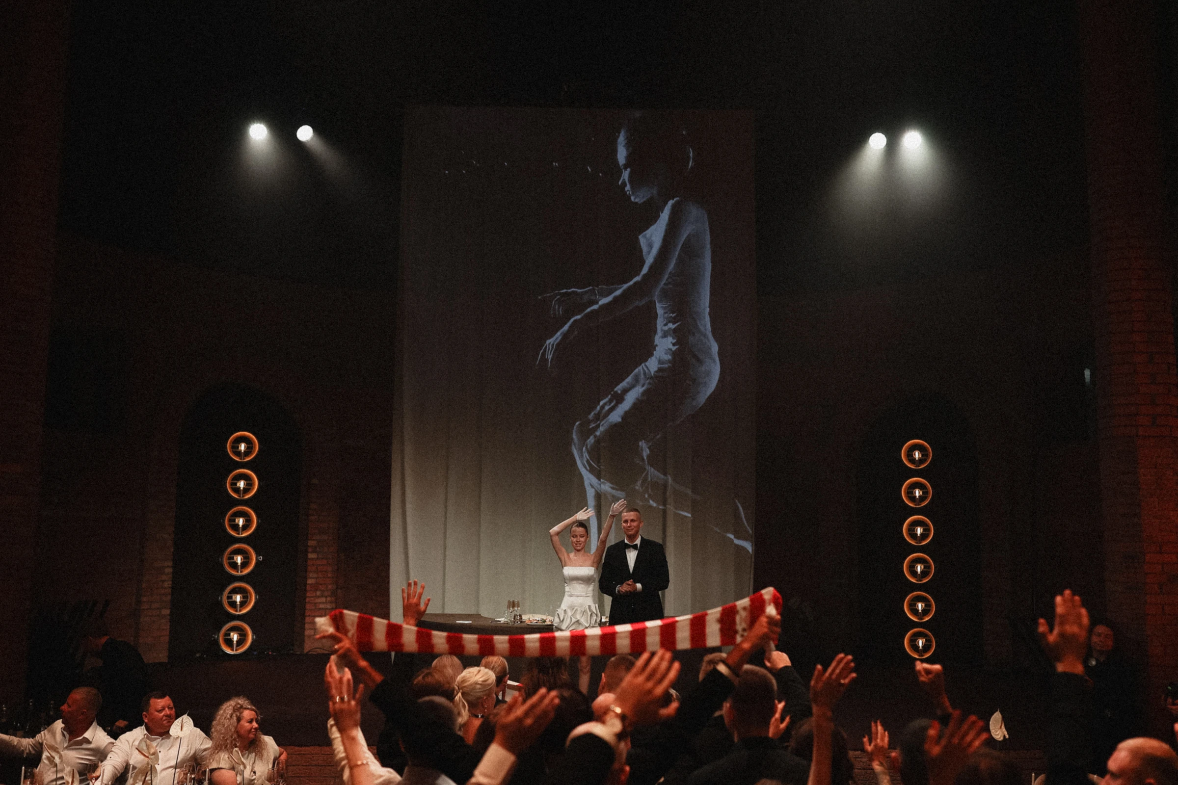 Авторские столы с внутренней подсветкой превращали банкетную зону в светящуюся инсталляцию. Десятиметровое подвижное полотно с проекцией подводной съемки пары создавало эффект живой, дышащей стены — отсылка и к Мальдивам, где началась эта история, и к ощущению погружения в момент.