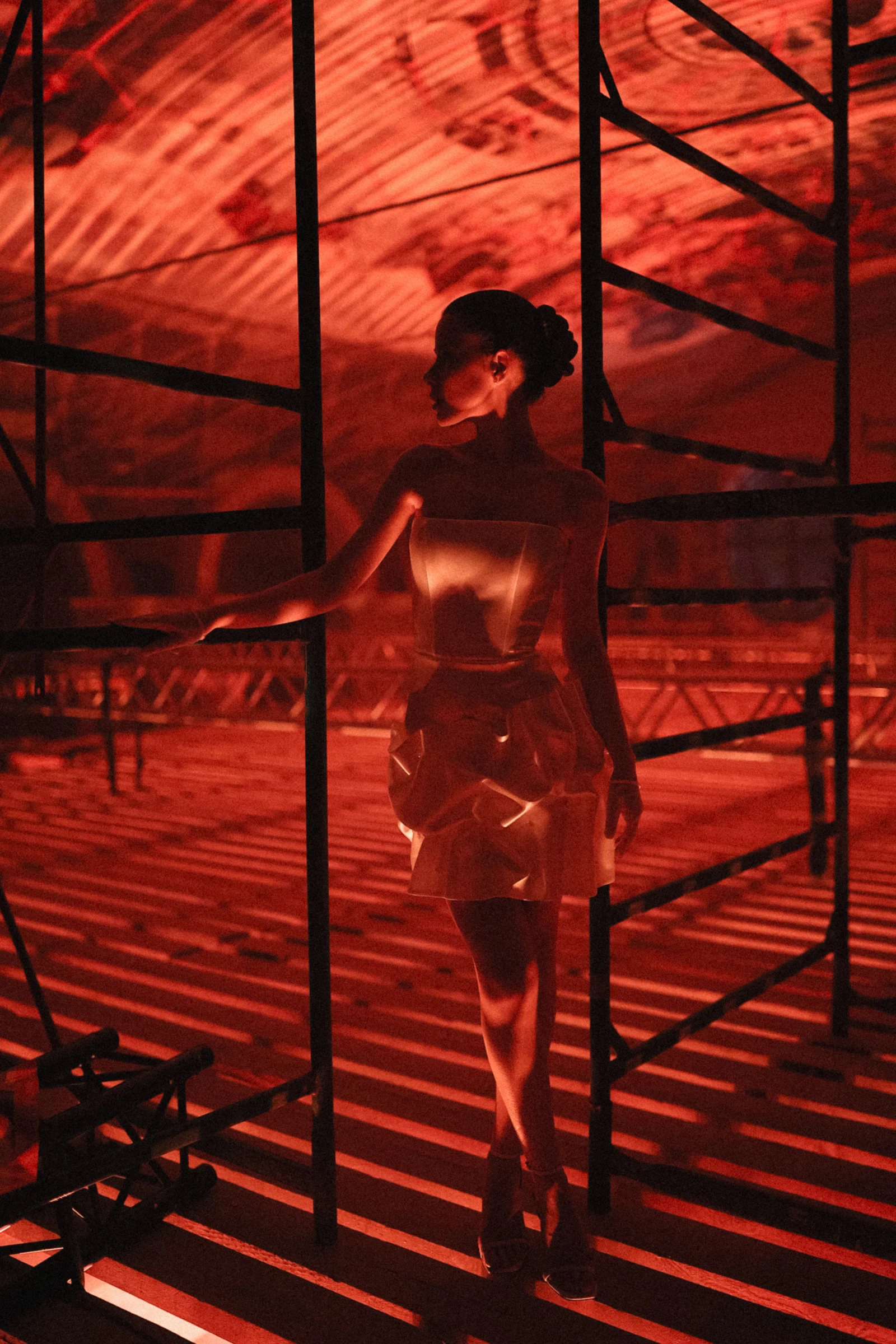 Этот проект стал вызовом — в первую очередь, с инженерной точки зрения. Площадка на этапе отделки — это бетонные стены, строительная пыль и полное отсутствие инфраструктуры. За трое суток команда с нуля создала все необходимое для шоу: смонтировала полторы тонны конструкций, установила силовые фермы на высоте семнадцати метров, проложила два километра кабельных трасс для световой архитектуры.