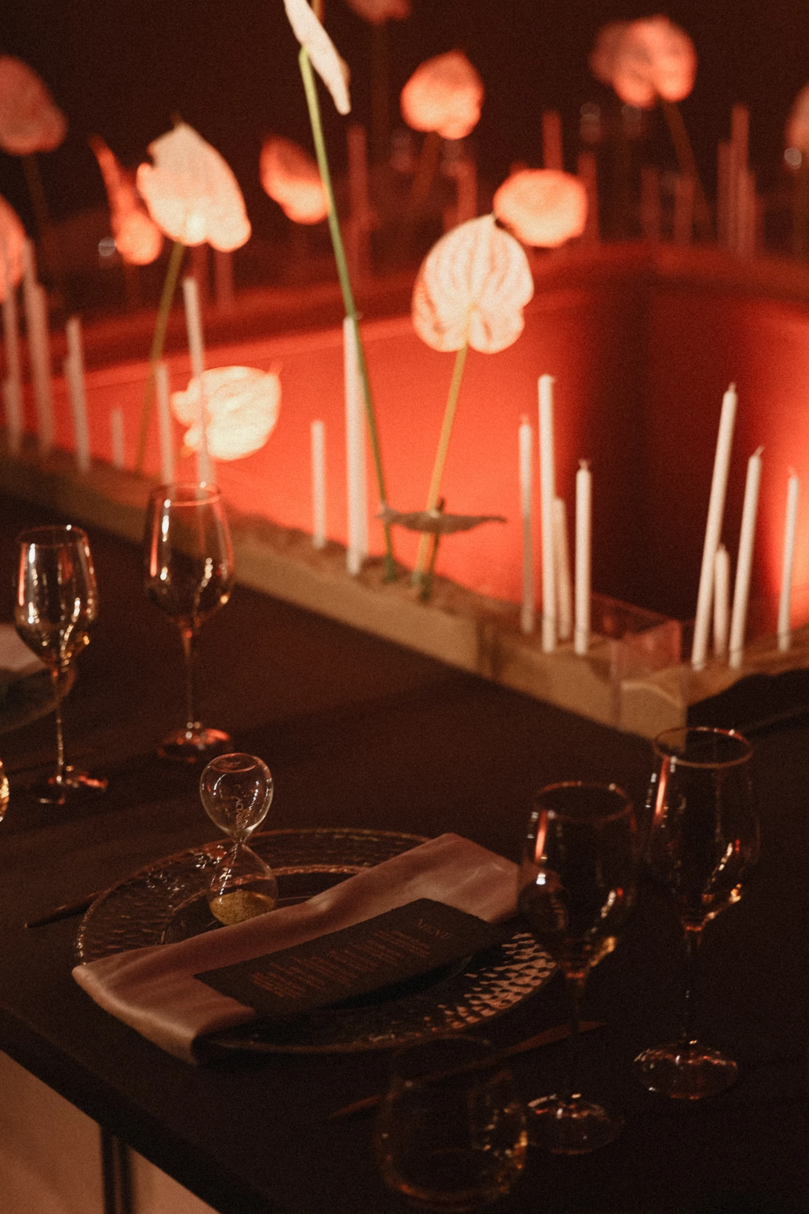 Девятиметровое полотно с подводной проекцией стало главным арт-объектом вечера: движущееся изображение менялось в течение всего события, задавая настроение. Авторские столы со внутренней подсветкой превратили ужин в часть инсталляции. Песочные часы с именами гостей — в деталь, которую каждый унес с собой.