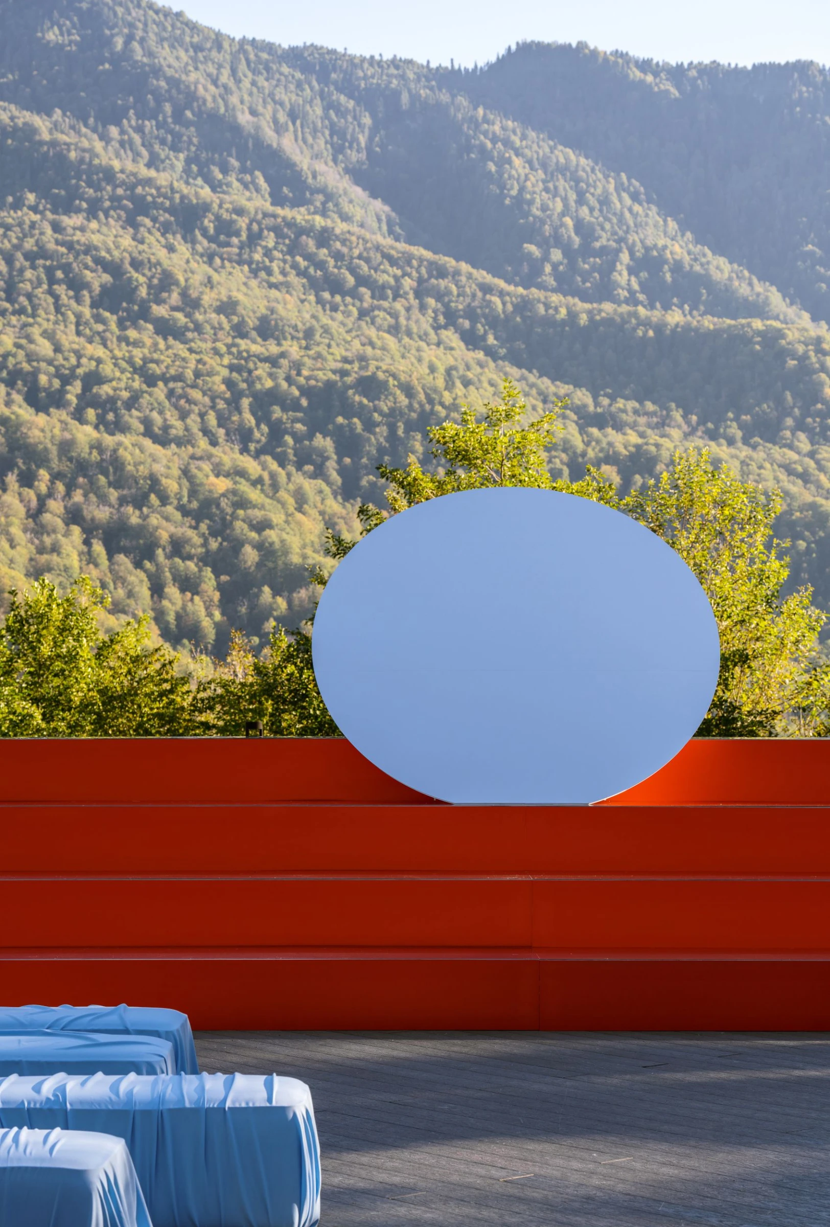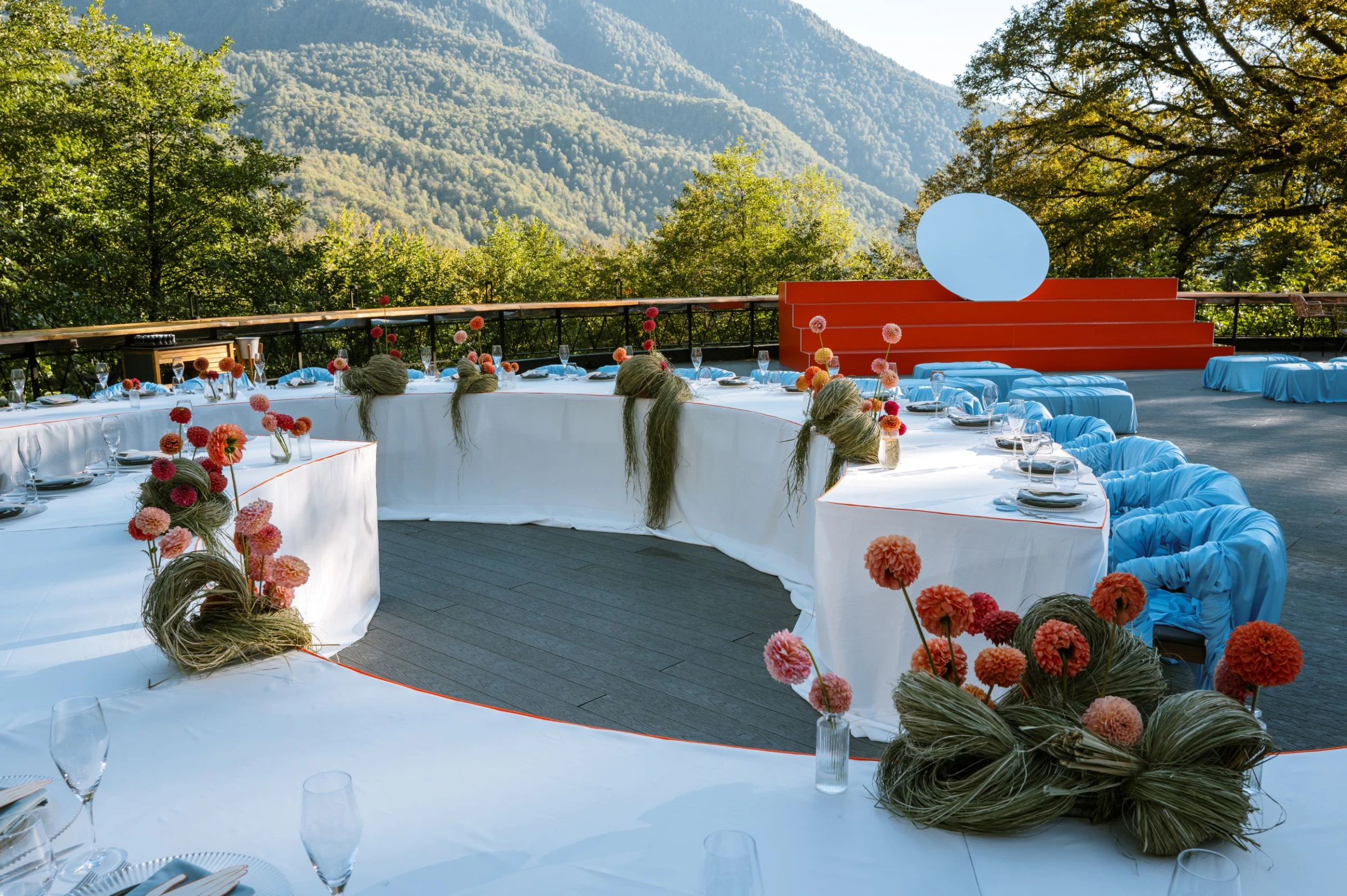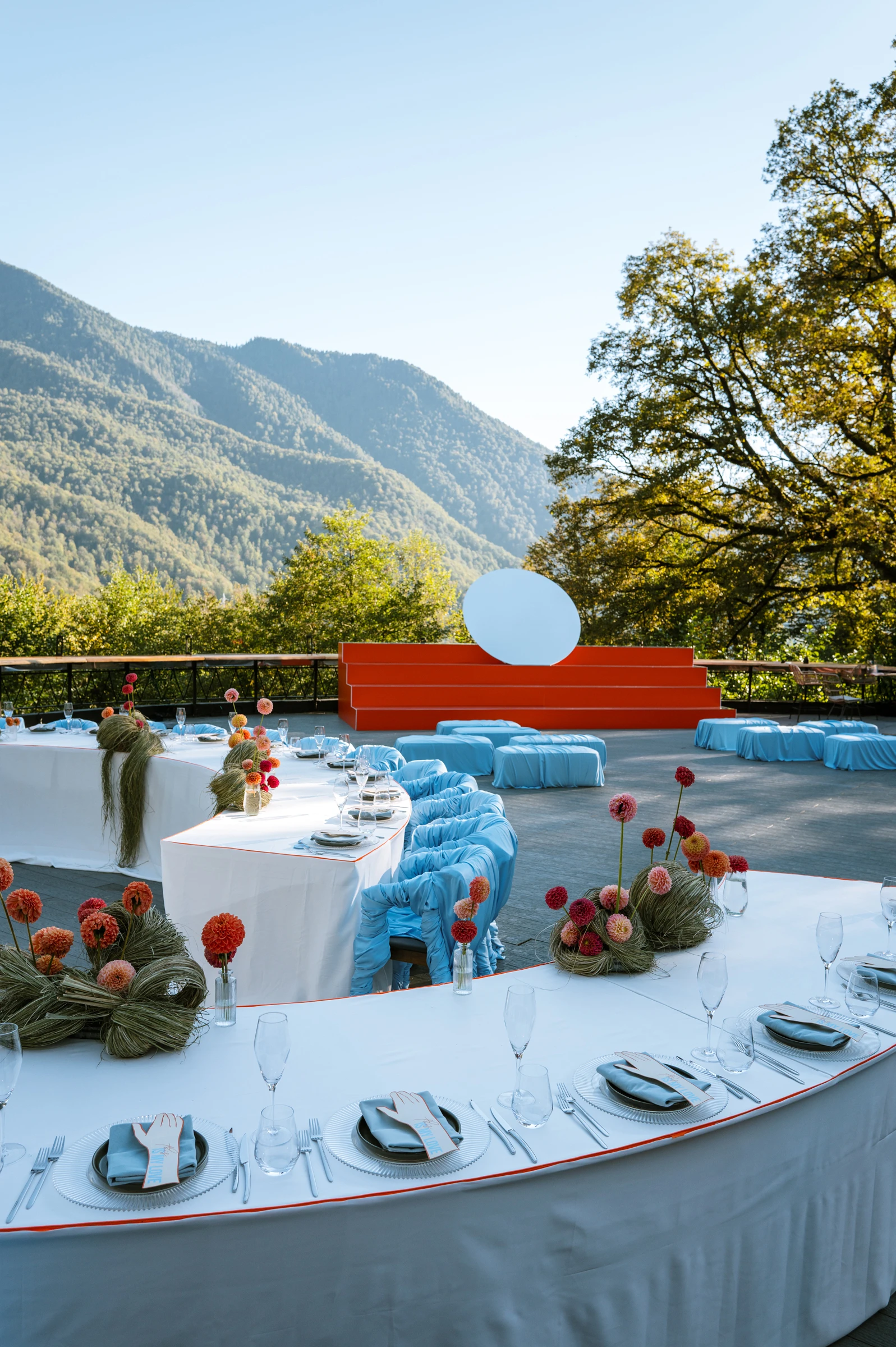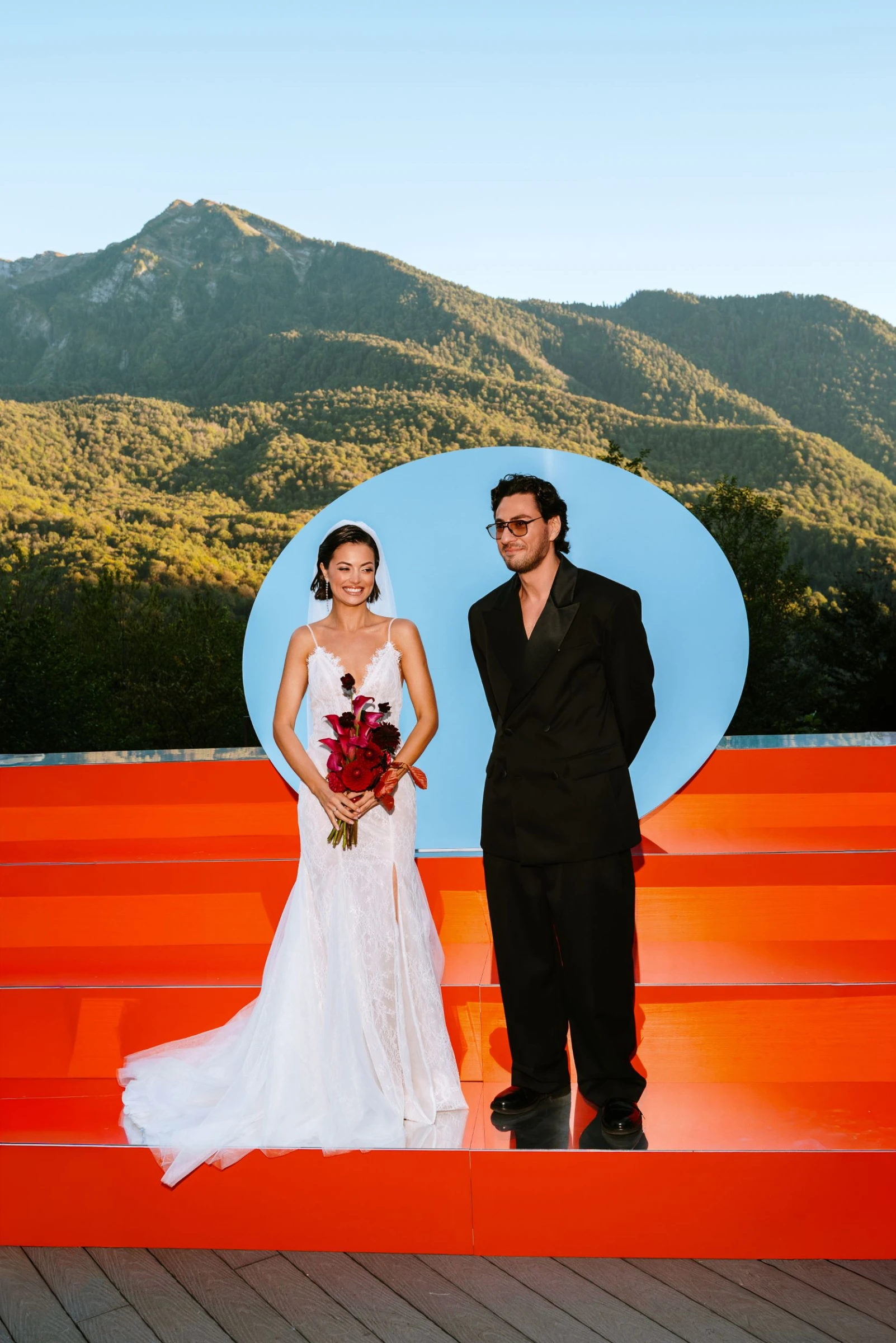 Вся концепция строилась вокруг отражений, а главным элементом стал зеркальный круг. Когда Таня и Руслан стояли перед ним, в нем показывалось сразу все — горы, небо, лица гостей. Казалось, что это одновременно и камерное, и космическое соединение.