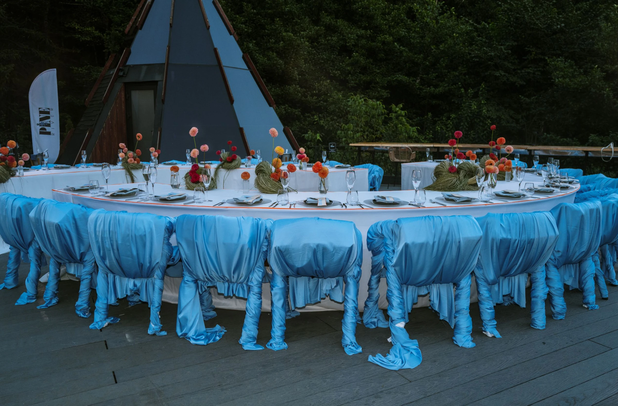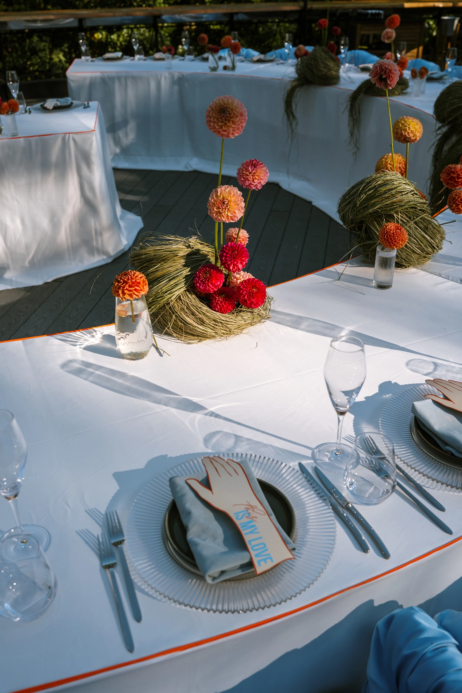 Голубой и коралловый — смелое комбо, которое сначала казалось очень ярким, но по итогу задавало игривое и суперживое настроение. Детали создавались вручную: тканевые стулья, карточки рассадки, меню в виде тех самых желтых перчаток — маленькая отсылка к моменту, когда Таня покорила Руслана.