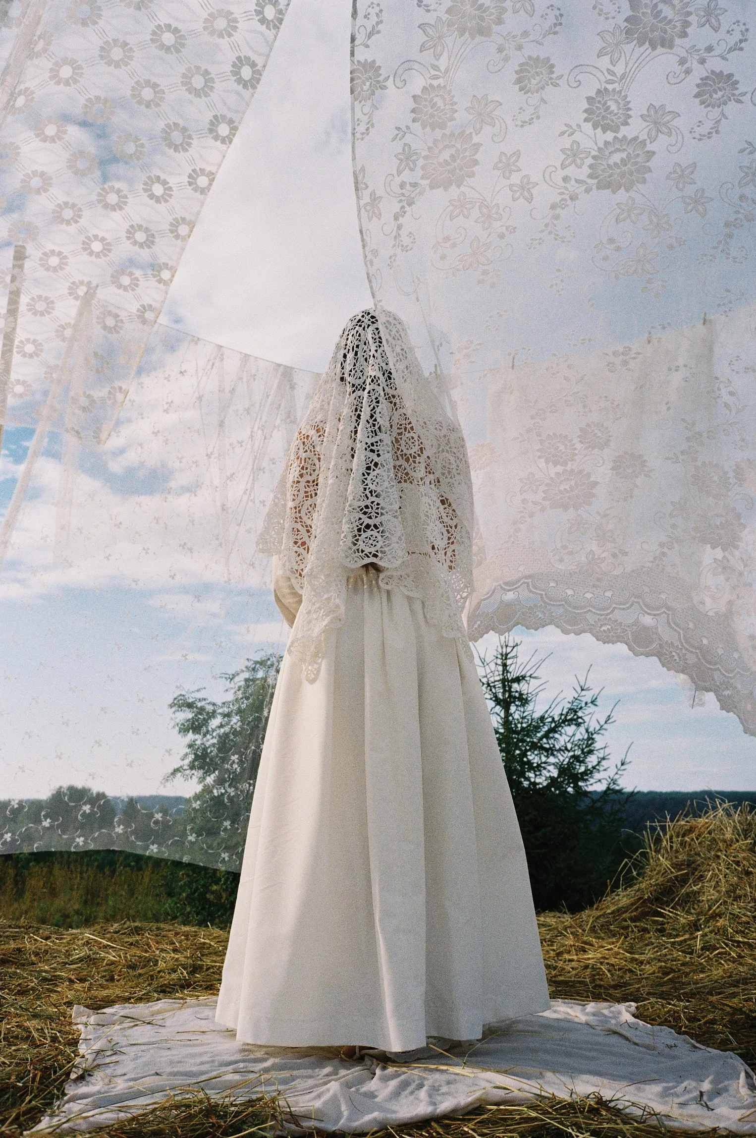 Когда началась церемония, все замерло. Выглянуло солнце, собрались жители деревни — казалось, весь мир остановился. Жених вышел под песню Хаски — «Сказки» («Играйте, гусли, гуляй, братва...»), невеста с братом — под ALT-J — Matilda. Так, стоя в поле и глядя друг другу в глаза, они произнесли клятвы — с уважением, «на вы». После церемонии началось веселое шествие в соседнюю деревню — с частушками под гармонь. Бабушки хотели устроить западню по традициям, но в итоге поздравляли и желали благ.