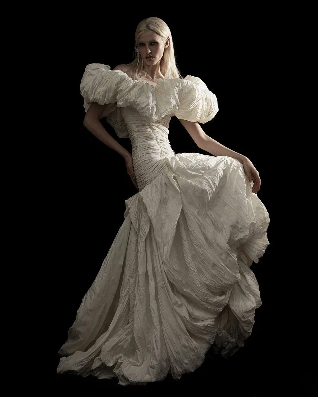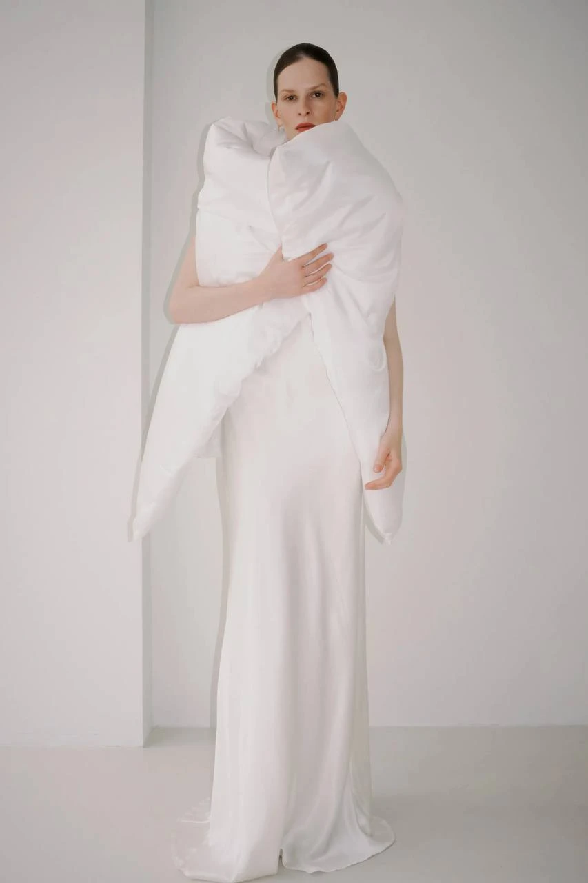 Если с декором есть четкие правила, то с нарядами нет никаких ограничений. Наоборот, эксперименты только приветствуются. Например, можете надеть дутый кейп или накидку с имитацией вытачек — такие изделия напоминают одеяло, которое вы словно накинули перед церемонией. Платья-подушки, летящие халаты-кимоно, варианты с драпировками и мягким силуэтом — вот ориентир. Если же подобные решения слишком смелые, всегда можете обратиться к нетленной классике и надеть платье-комбинацию. Это бельевая модель, которая не только впишется в нашумевшую эстетику Bedtime, но и подойдет каждой на все случаи жизни.