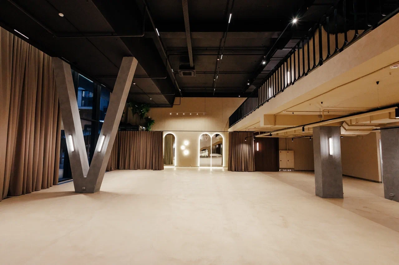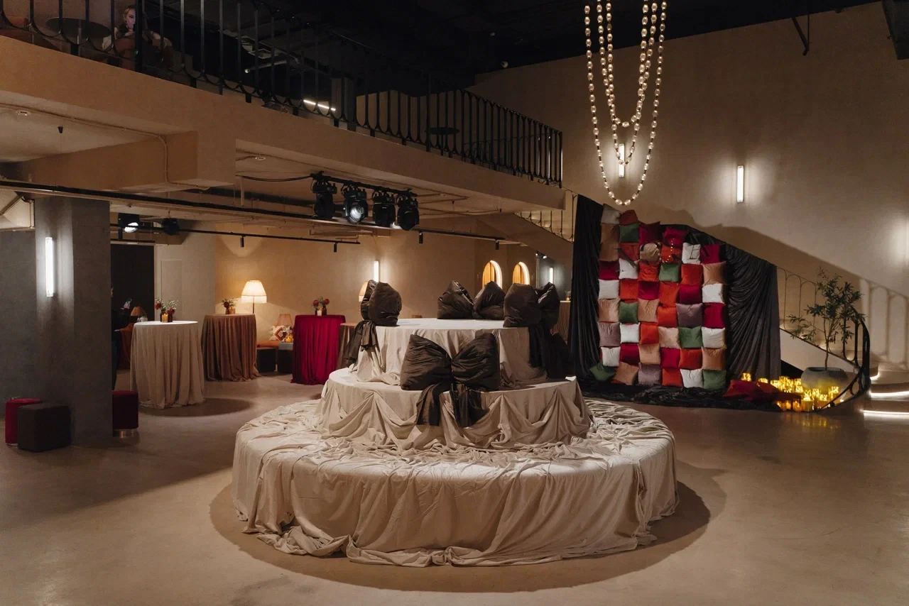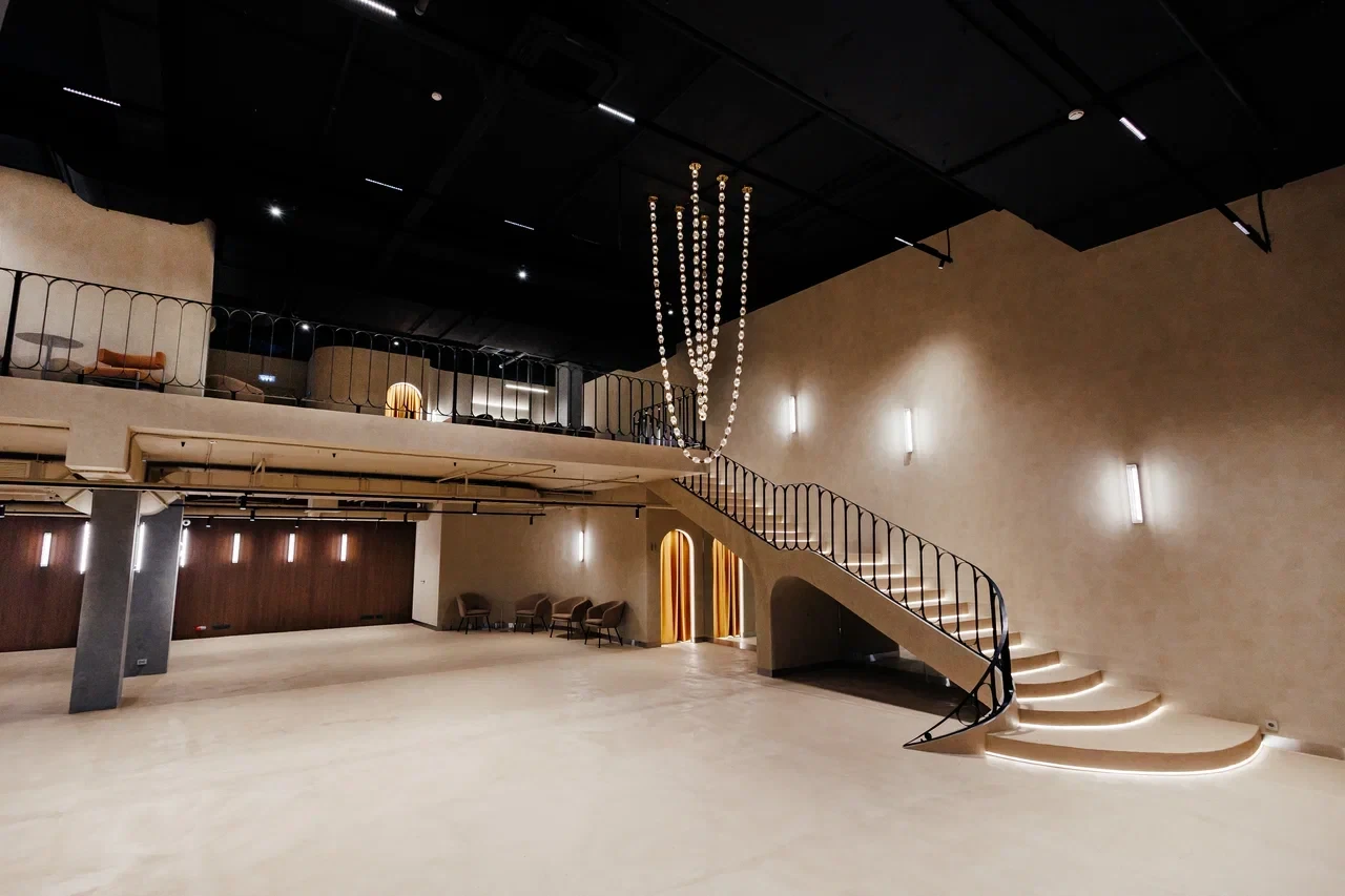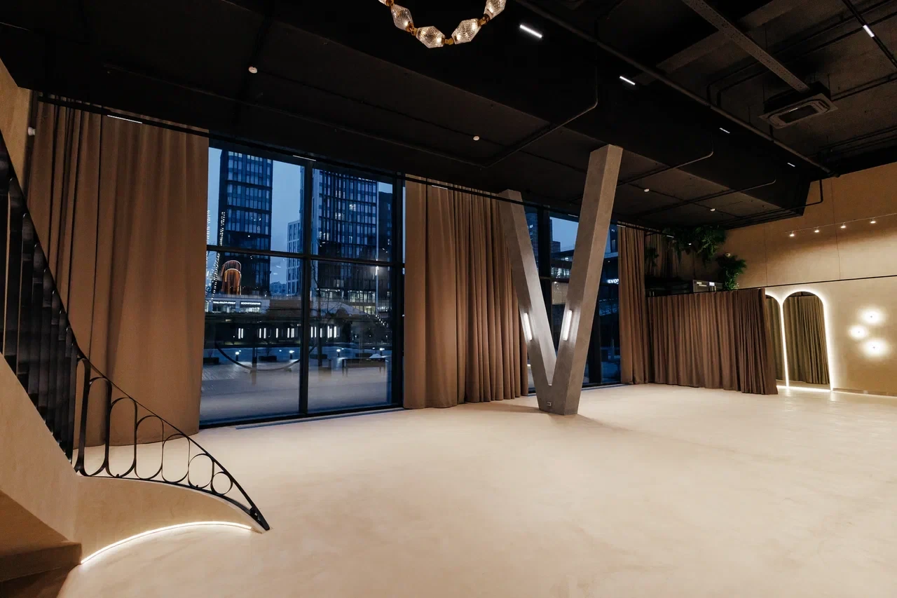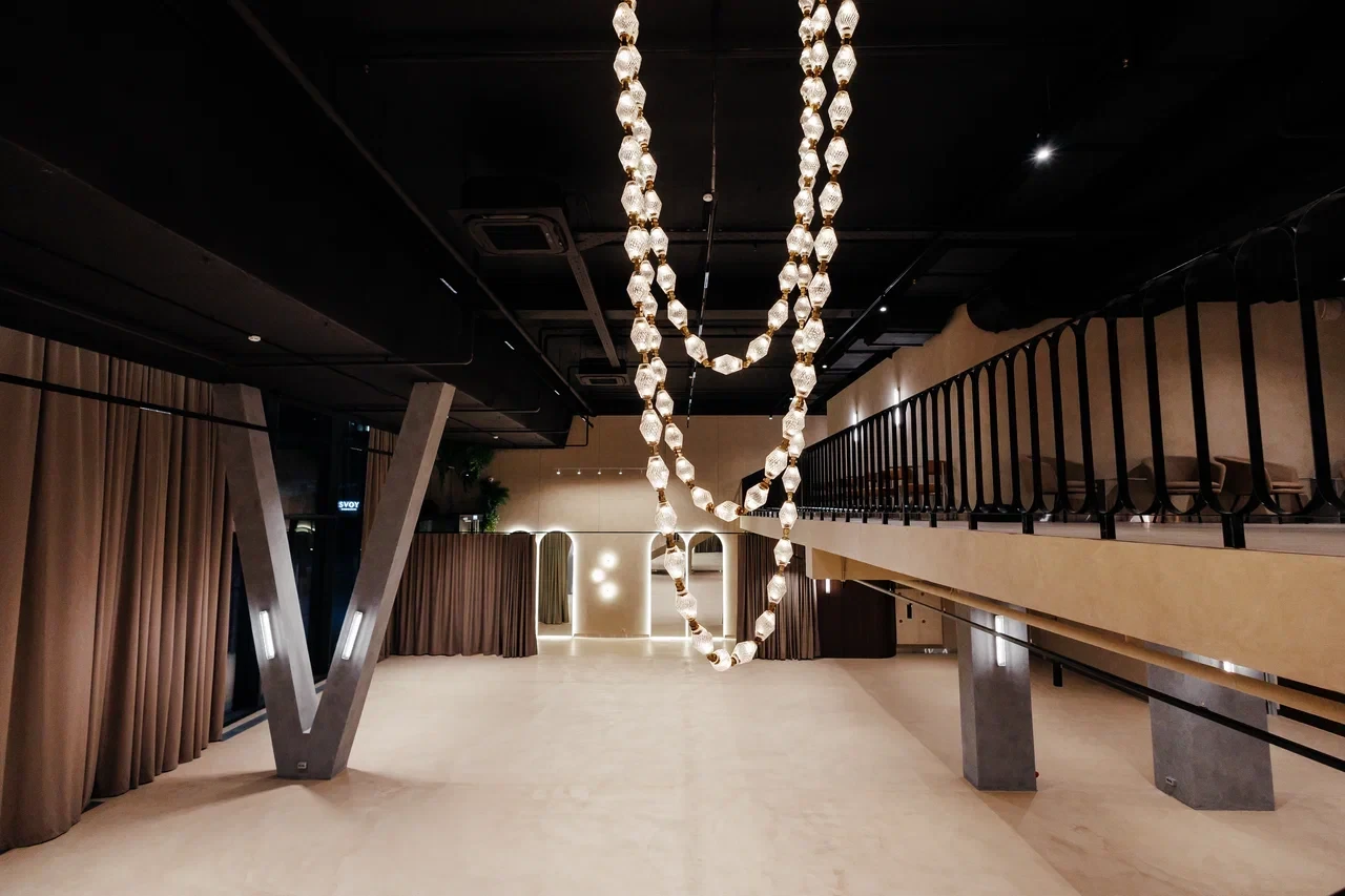 SVOY ХАМОВНИКИ — эксклюзивная площадка для мероприятий в самом сердце Москвы, в историческом и престижном районе Хамовники. Пространство выполнено в дизайнерском интерьере, оформленном в трендовом цвете Pantone 2025, что подчёркивает современный взгляд на эстетику и создаёт актуальную визуальную среду для мероприятий любого уровня. Центральным элементом зала стала уникальная дизайнерская люстра, которая формирует выразительный акцент и усиливает атмосферу изысканности.